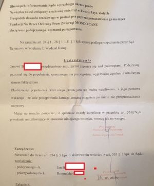 2. Wniosek prokuratora z Wielunia o skazanie bez rozprawy człowieka za wyrzucenie psa z samochodu. Również precedensowa sprawa. MONDO CANE zgadza się na takie rozstrzygnięcie, pies żyje i będzie przepadek na rzecz fundacji. Pan został skazany na 10 miesięcy pozbawienia wolności z zawieszeniem na 3 lata oraz nawiązkę w kwocie 3000 zł i koszty sądowe. Brawo Inspektorat Wieluń!