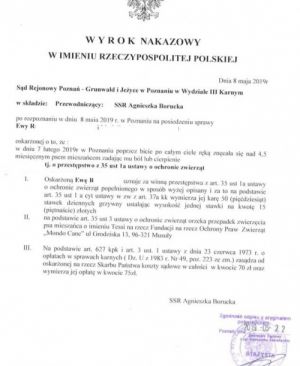 3. Tydzień temu Inspektorat Poznań również wywalczył wyrok. Za uderzenie psa ręką. Skazanie na grzywnę, przepadek psa na rzecz Mondo Cane i koszty sądowe.